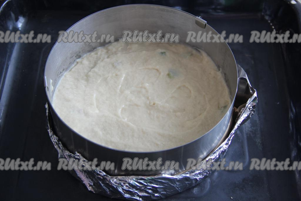 В форму диаметром 22 сантиметра (я взяла бортики, а дно укрепила фольгой) выложить половину теста.