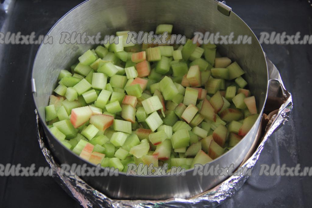 Выложить кусочки ревеня поверх теста.
