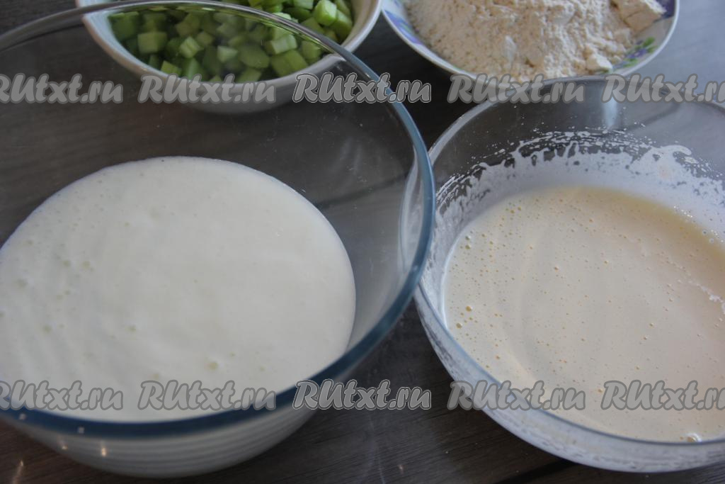 В другую миску влить кефир, всыпать в него соду, хорошо перемешать и дать постоять минут 5 (сода за это время погасится в кефире).