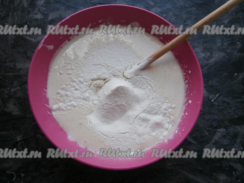 Добавить частями просеянную муку, каждый раз аккуратно её вмешивая в смесь яиц и мёда.