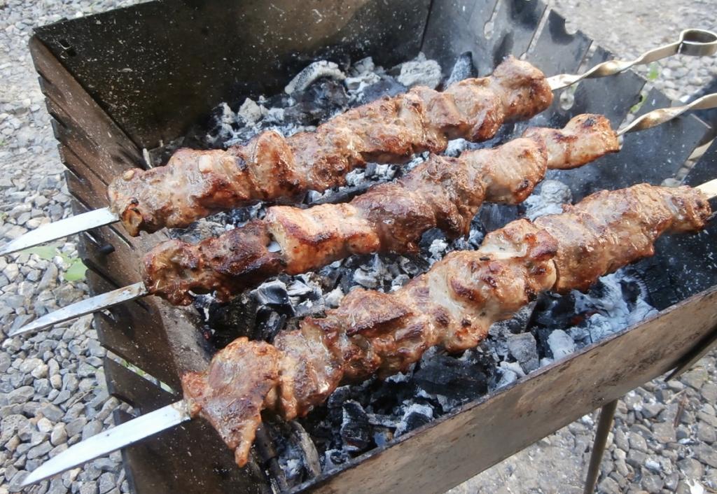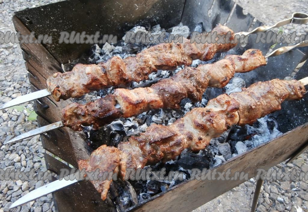 И жарить шашлык на седых углях, часто переворачивая, не более 15 минут, без прямого огня. Готовность можно проверить, отрезав кусочек мяса, в разрезе не должно быть примесей крови.