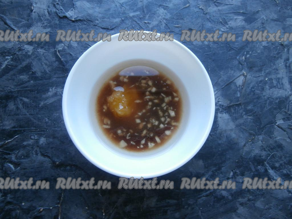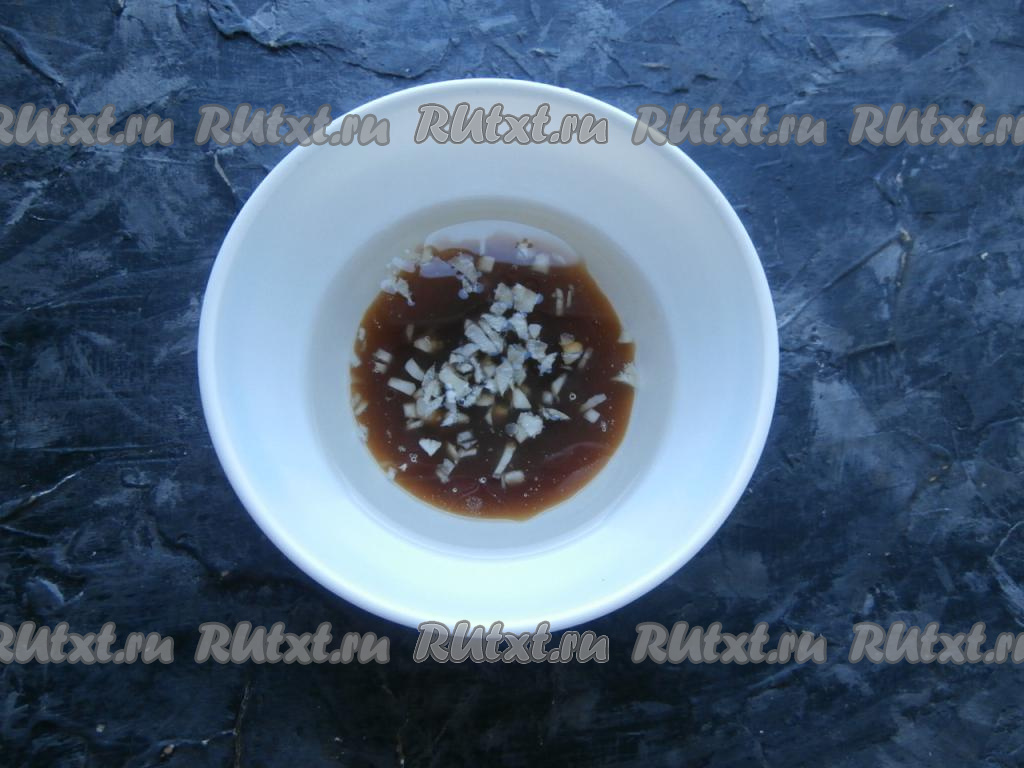 Приготовить маринад. Для этого растительное масло влить в отдельную миску, добавить к нему соевый соус, мелко нарезанный ножом чеснок, влить яблочный уксус (вместо яблочного уксуса можно использовать винный или столовый уксус, или свежевыжатый лимонный сок).