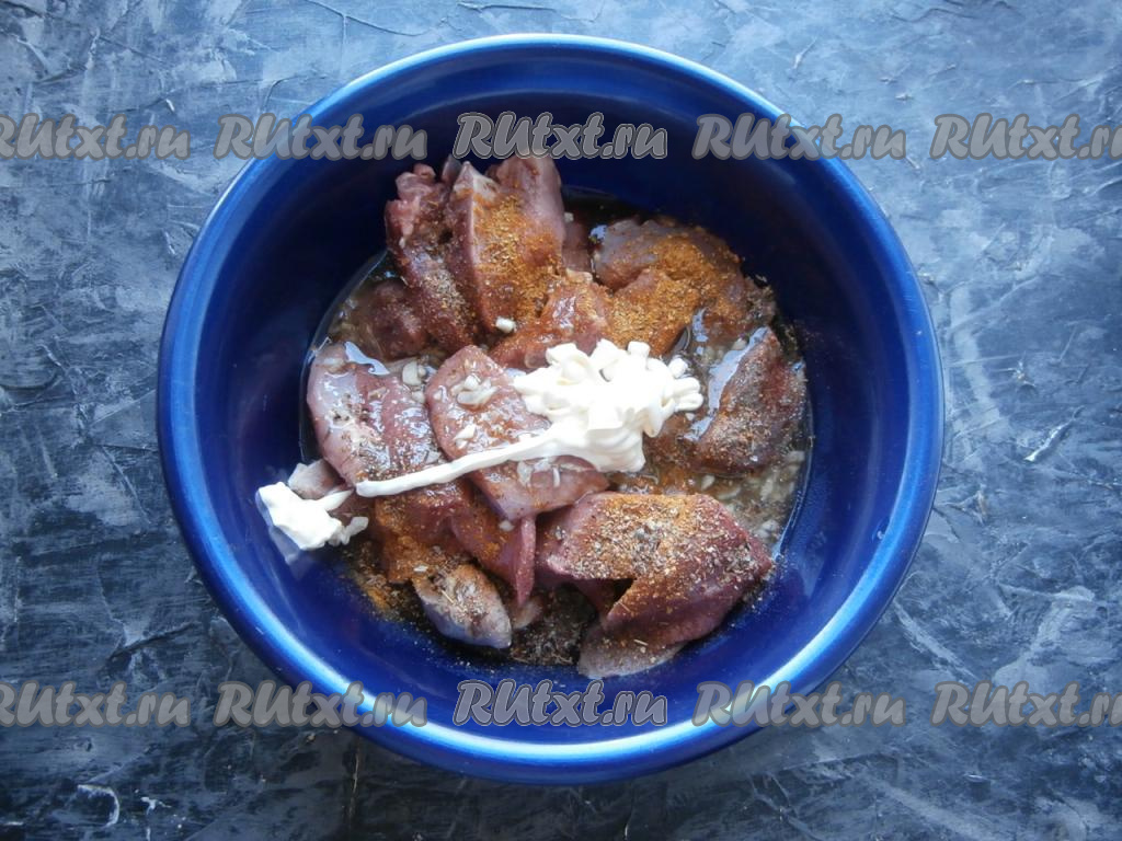 Утиные грудки посолить, посыпать приправой и молотым перцем, влить маринад, добавить майонез.