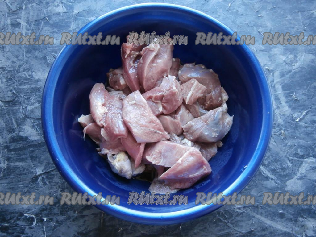Нарезать грудки на кусочки размером, приблизительно, 4 сантиметра на 4 сантиметра.