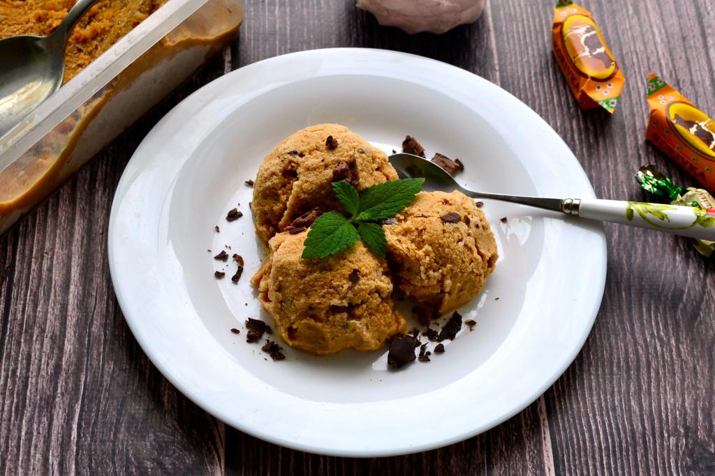 Невероятно вкусное домашнее мороженое, приготовленное с варёной сгущёнкой, подать к столу, я его дополнила кусочками шоколада и листиками мяты.