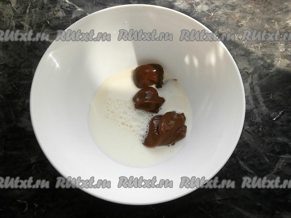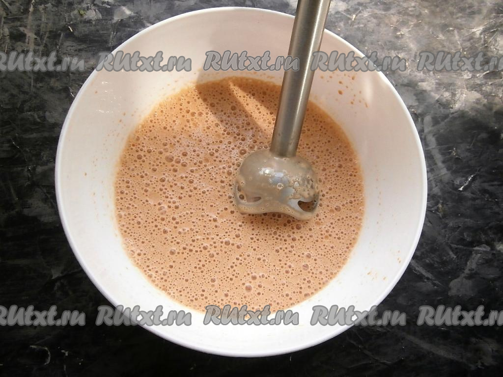 Тщательно взбить молоко (или сливки) с варёной сгущёнкой погружным блендером до пышной пены.