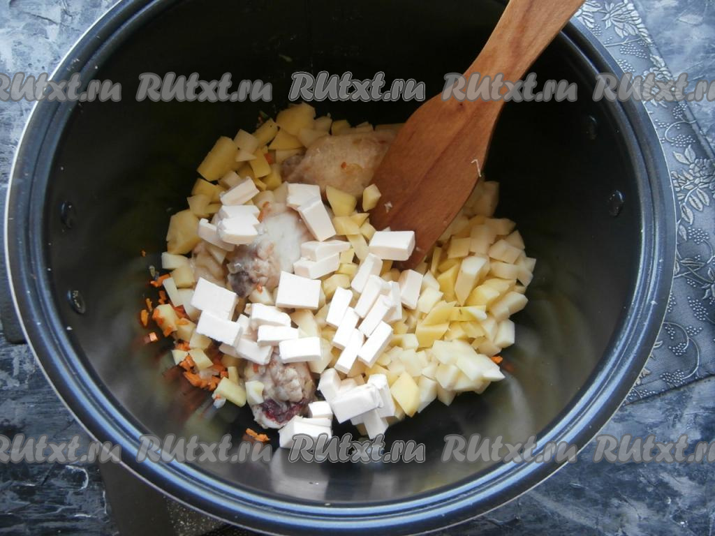 Сюда же сразу добавить нарезанный кубиками плавленый сыр.
