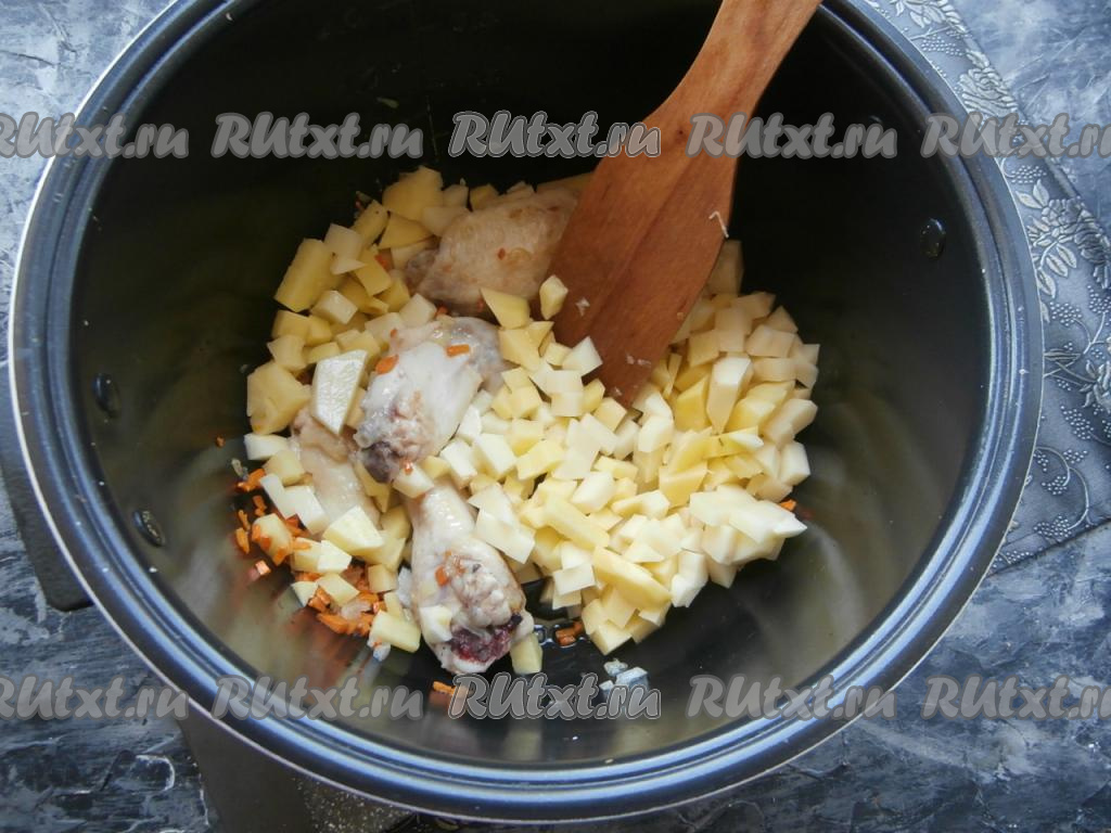 Обжаривать кусочки курицы, периодически перемешивая, до звукового сигнала. Затем добавить очищенный и нарезанный на небольшие кубики картофель.