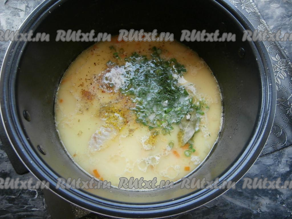 Через 45 минут готовки сырного супа с курицей, добавить в мультиварку соль, специи, зелёный лук, укроп, лавровый лист и чеснок, перемешать.