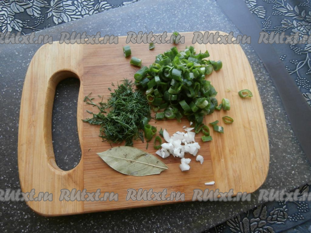 Измельчить зелень лука и укропа, мелко нарезать чеснок, подготовить лавровый лист.