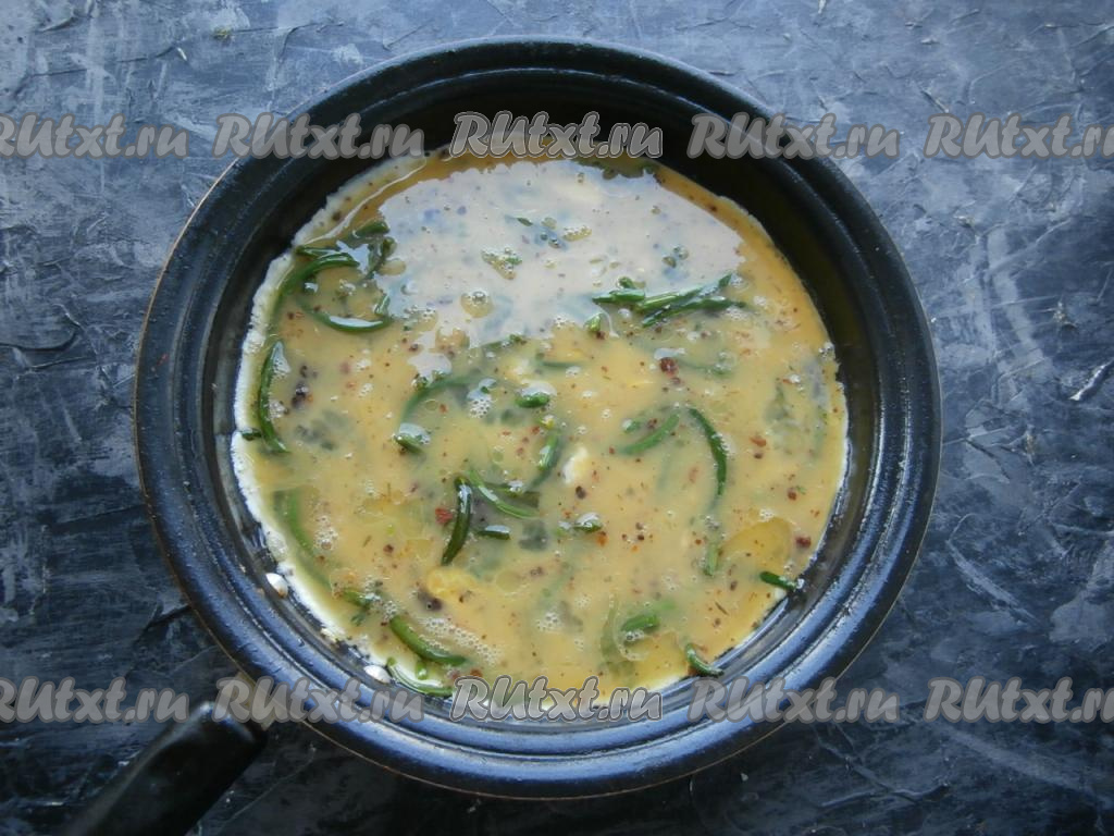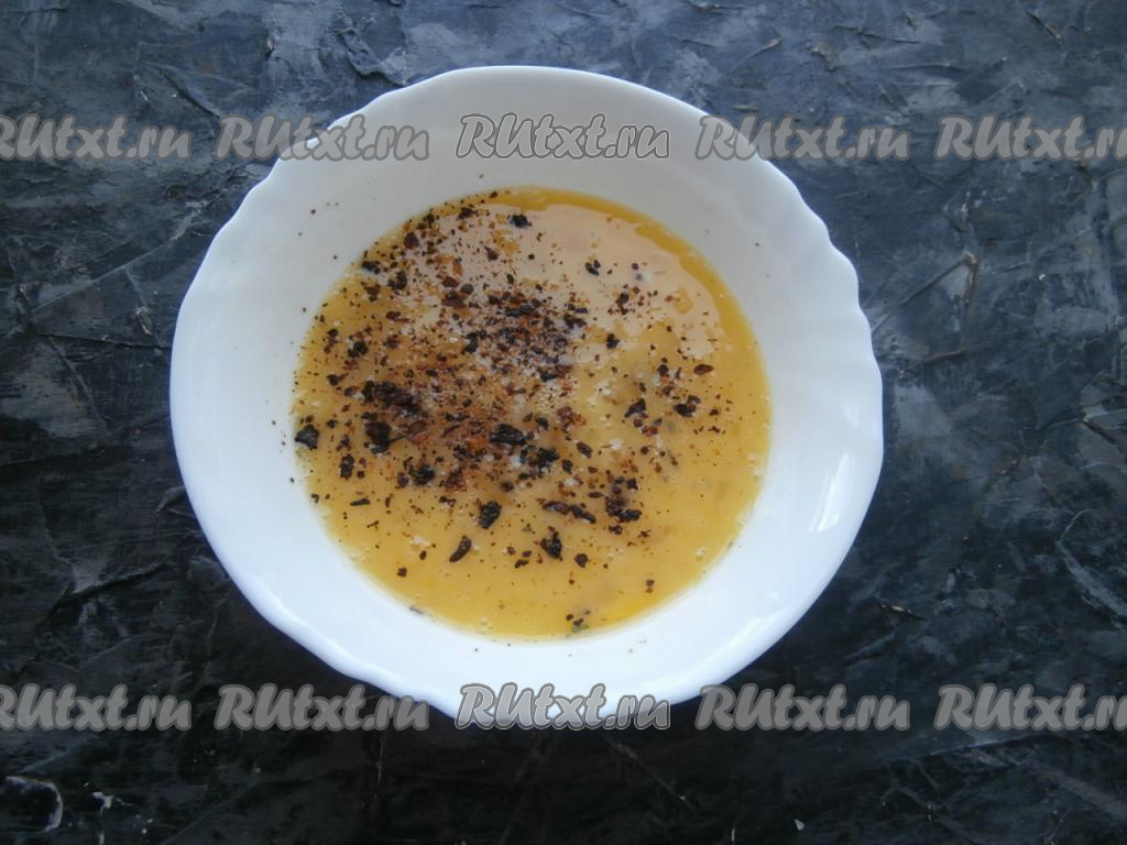 Яйца разбить в миску, добавить соль, приправу, специи.