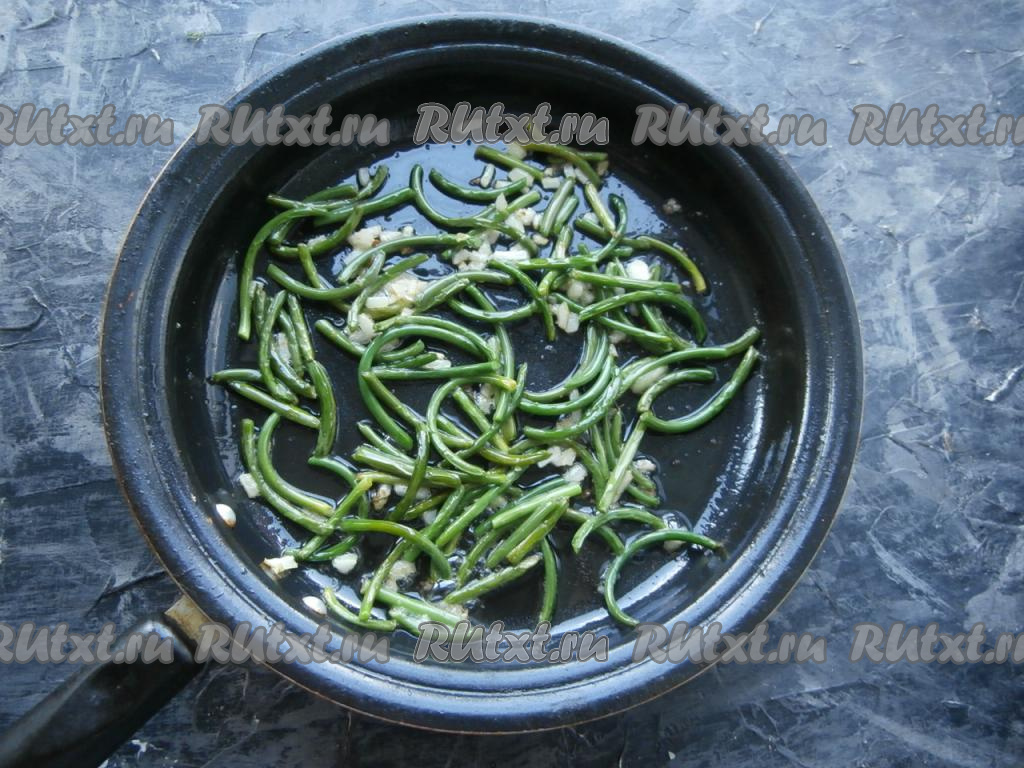 Обжарить стрелки с луком, помешивая, в течение 3-5 минут на небольшом огне.