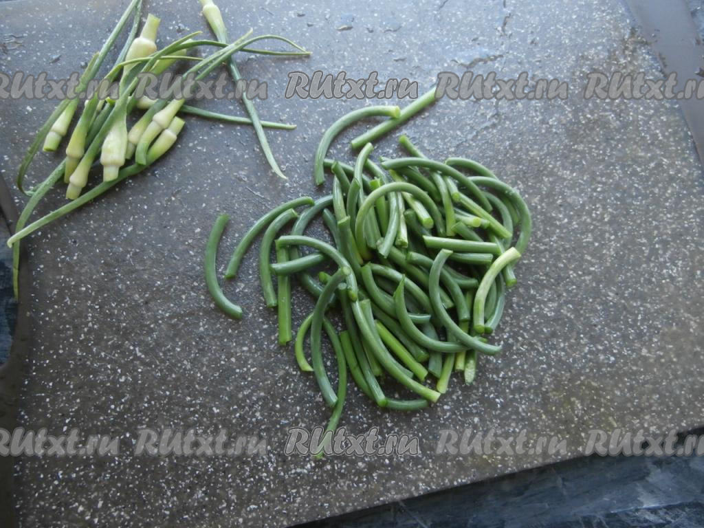 Чесночные стрелки помыть, удалить верхнюю семенную часть, затем сами стрелки нарезать на части, чтобы они были длиной 3-4 сантиметра. Очистить половину луковицы.