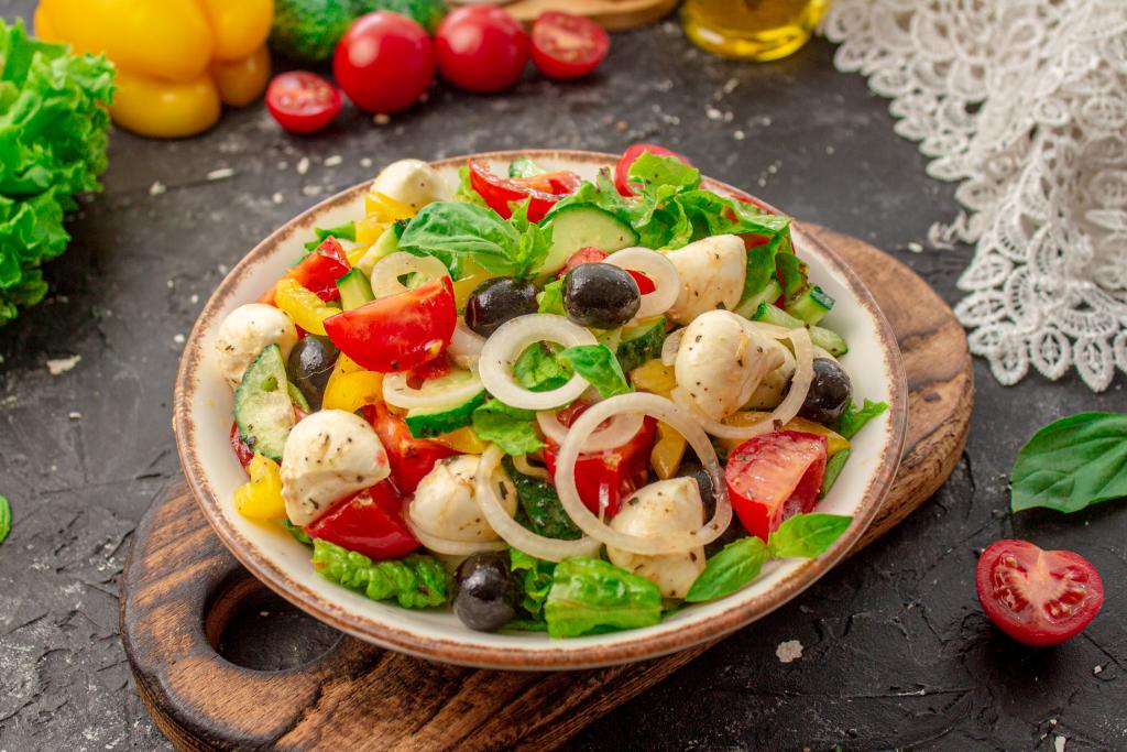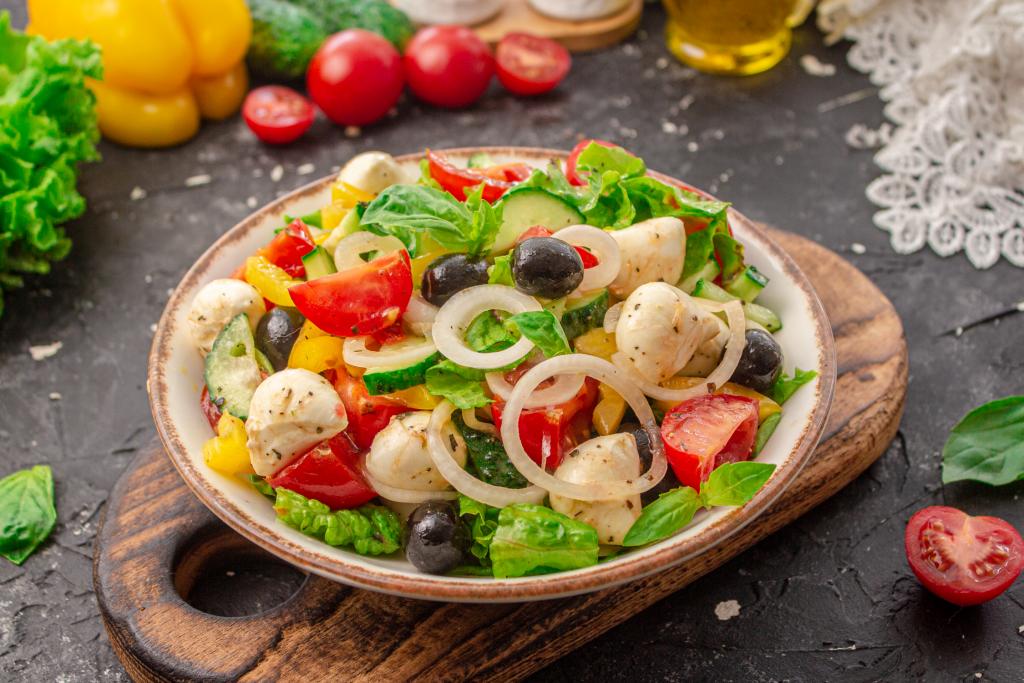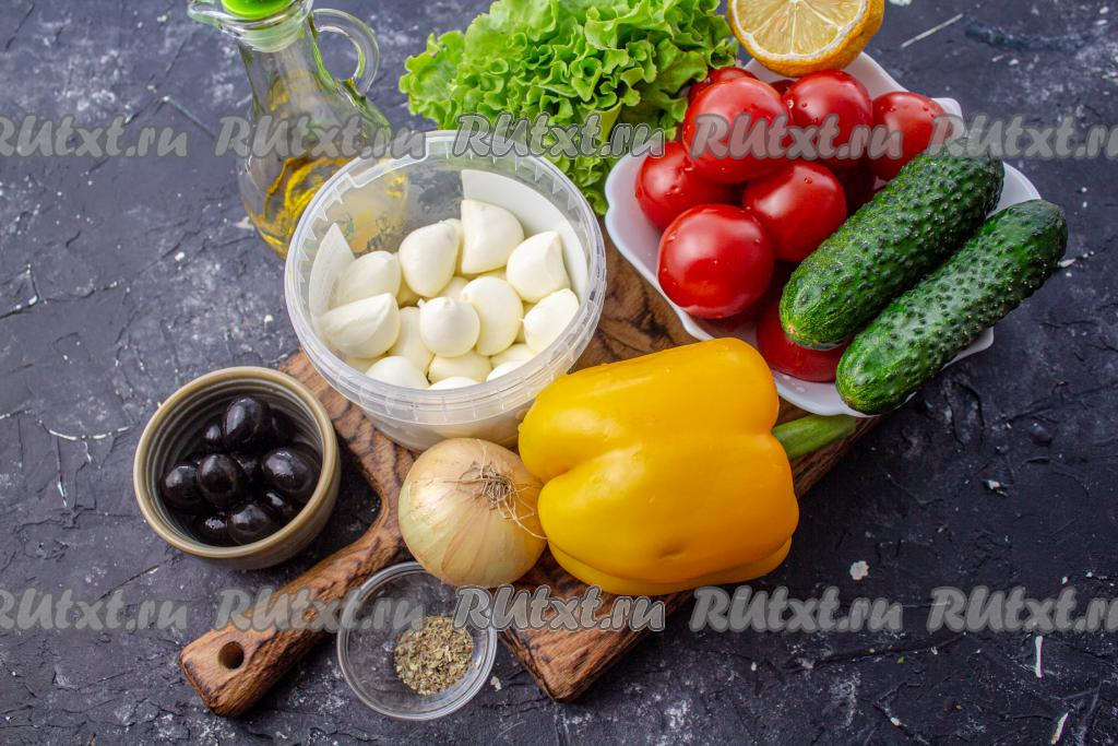 Сочный, яркий, ароматный греческий салат с моцареллой можно предложить как самостоятельное блюдо на ужин или дополнить его запечённым мясом, рыбой.