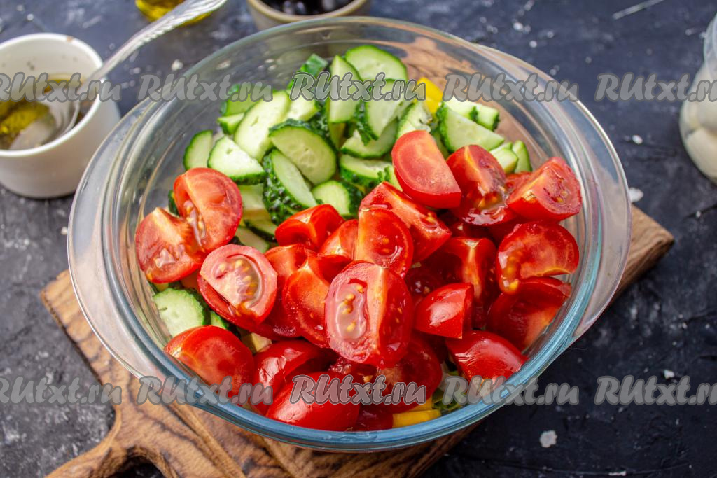 Огурцы и помидоры промойте и обсушите. Огурцы нарежьте на полукружочки (или кружочки), помидоры нарежьте на дольки и переложите овощи в салатник.