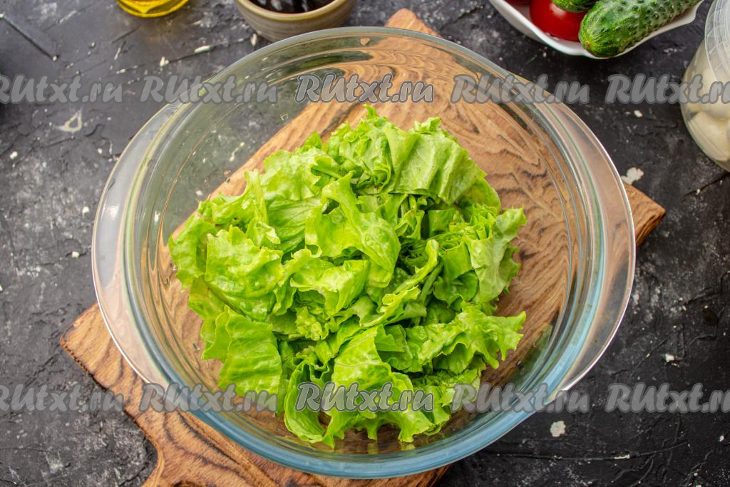 Листья салата промойте и обсушите. Порвите руками (или нарежьте) салат на небольшие кусочки, выложите в салатник.