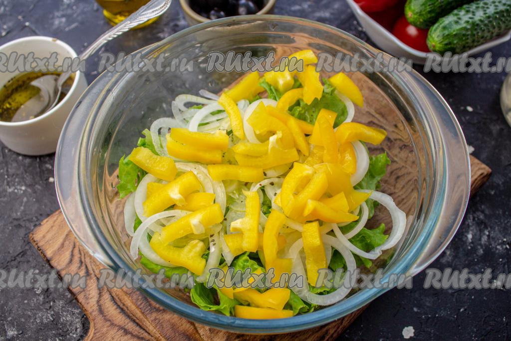 Болгарский перец, очищенный от семян, нарежьте на небольшие кусочки и тоже добавьте в салатник.