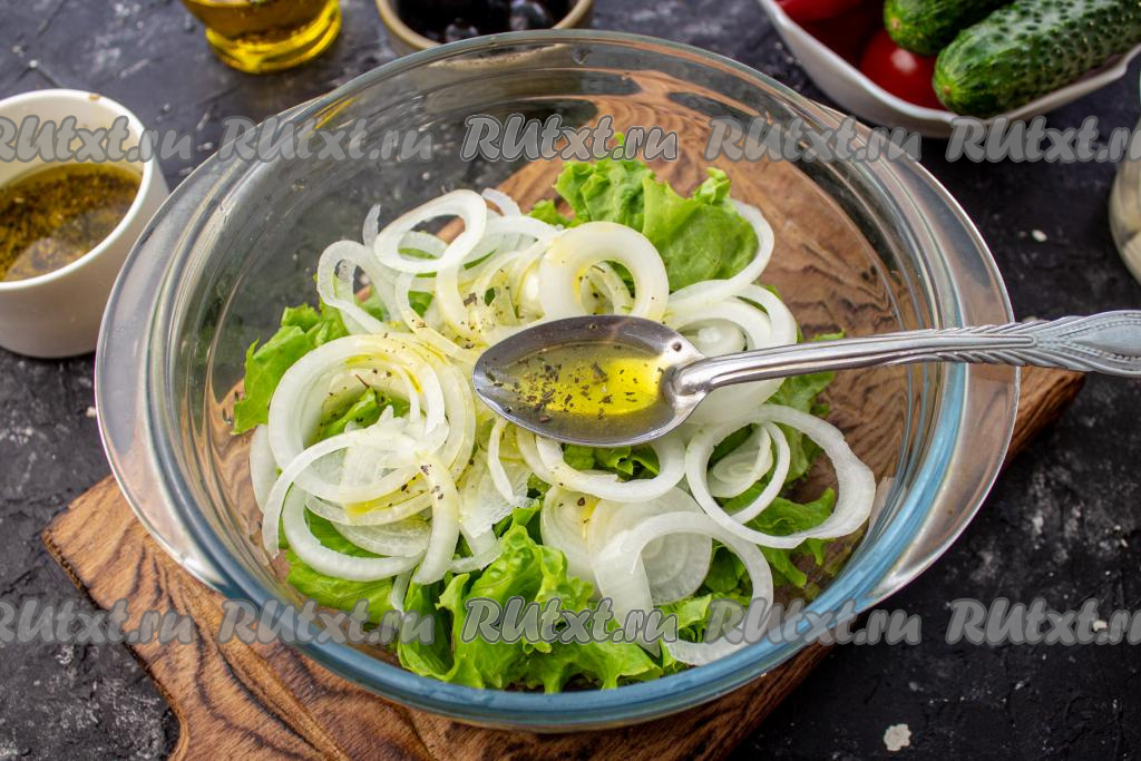 Репчатый лук очистите и нарежьте на тонкие кружочки, добавьте в салатник.