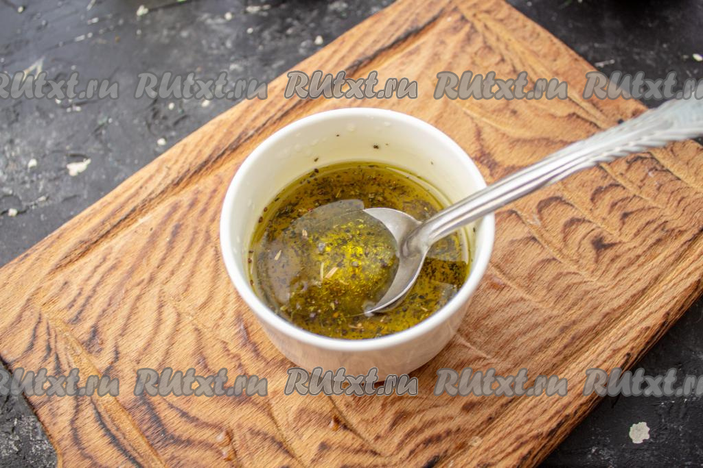 Первым делом приготовьте заправку, для этого в отдельной ёмкости соедините оливковое масло, лимонный сок, сушёные орегано и базилик, перемешайте.