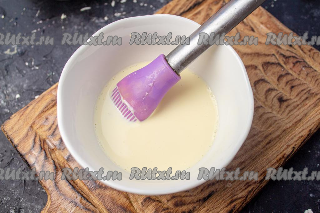 Для получения заливки смешайте молоко, яйцо и сахарную пудру. Вместо пудры можно положить сахар, но тогда заливку перемешивайте до растворения сахара.