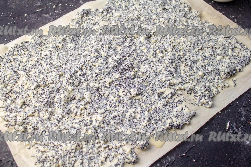 На заливку ровным слоем выложите творожно-маковую начинку, отступив от каждого края около 1 сантиметра.