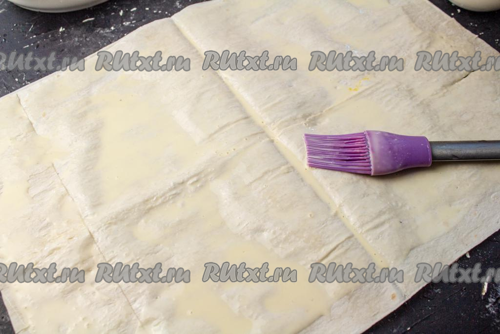 На стол выложите лист лаваша, смажьте его яично-молочной заливкой (немного оставьте для смазывания рулета).