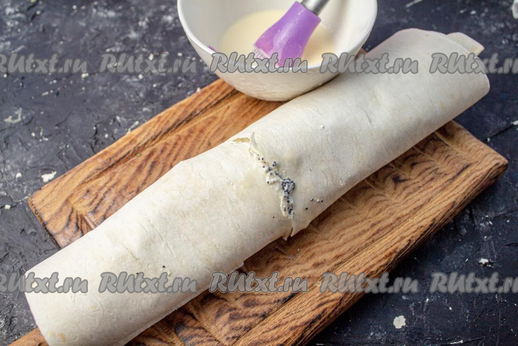 Начиная с узкого края, сверните лаваш в рулет. На противень, застеленный пергаментом, выложите рулет. Смажьте лаваш сверху оставшейся заливкой и поставьте минут на 20-25 в духовку, разогретую до 200 градусов.