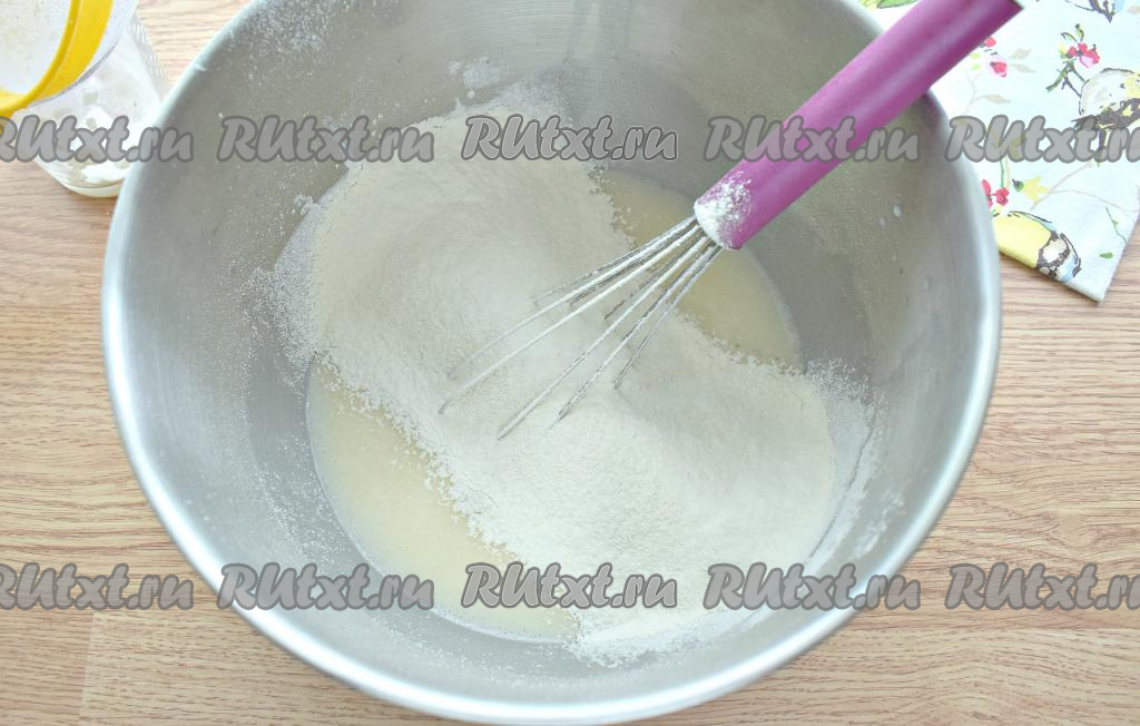 В получившуюся смесь просеиваем частями пшеничную муку, перемешивая венчиком.