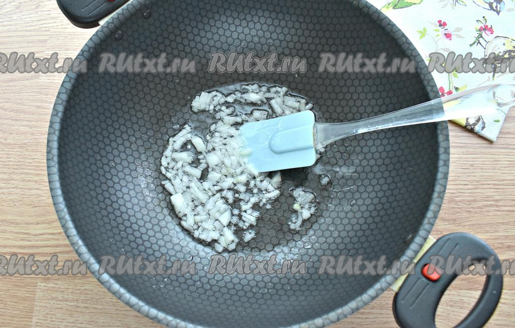 За это время приготовим начинку. Очищаем луковицу, нарезаем её мелко, выкладываем в сковороду, хорошо прогретую с растительным маслом, и обжариваем на среднем огне минуты 3-4 (до мягкости), периодически помешивая.