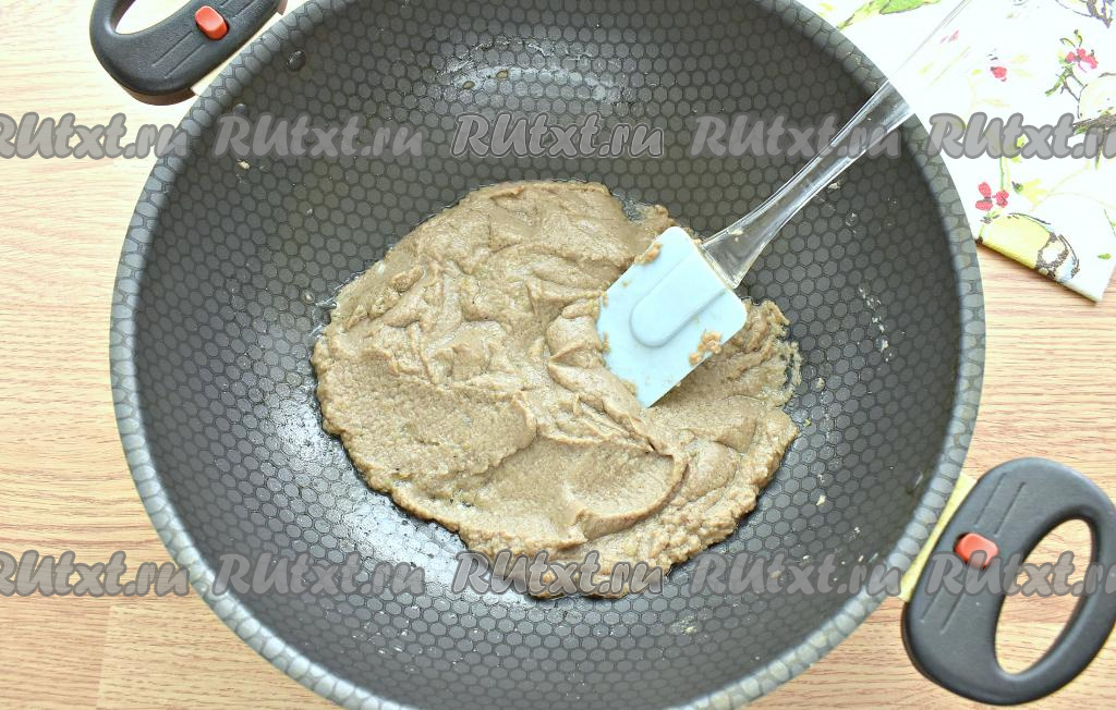 Обжариваем кусочки колбасы с луком 3-4 минуты, перемешивая. Начинка станет похожей по консистенции на паштет. Убираем с огня и даём немного остыть.