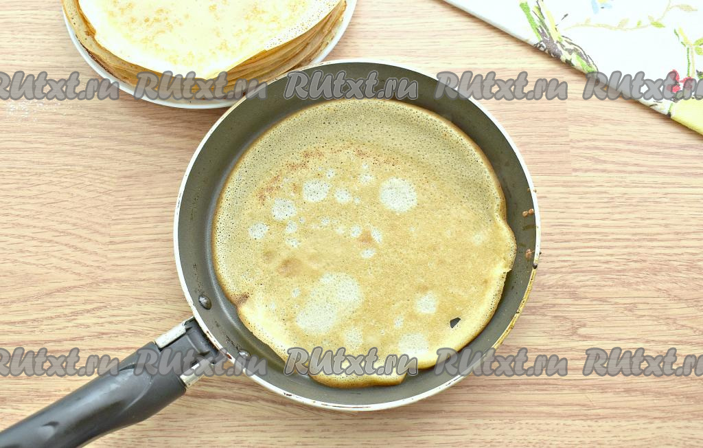 Тесто для блинов должно получиться жидким, однородным, вливаем в него 2 столовых ложки масла, перемешиваем и даём постоять 10-15 минут, накрыв миску тканевым полотенцем.