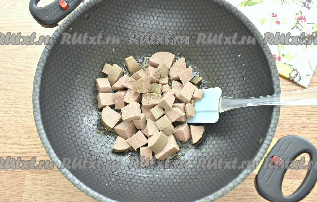 На сковороду с обжаренным луком выкладываем ливерную колбасу, нарезанную на кусочки, перемешиваем. Если нужно, то солим и перчим колбасу с луком (вначале обязательно попробуйте колбаску, возможно, специй вообще не потребуется).