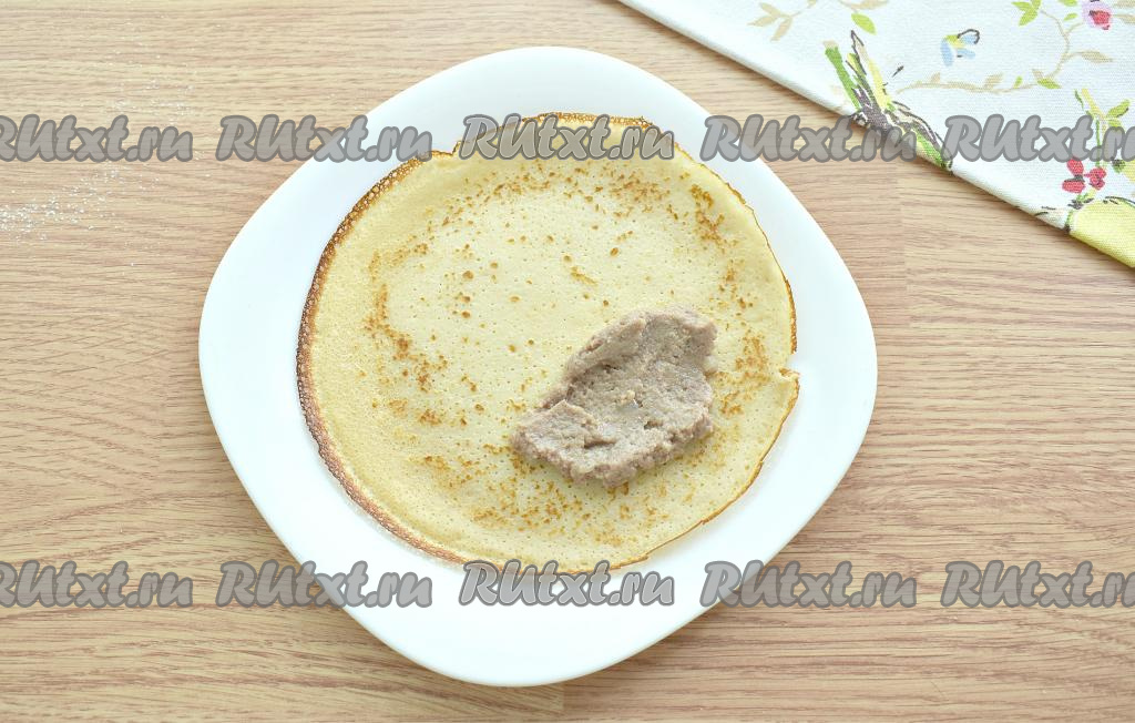 Когда и блины, и начинка будут тёплыми, можно приступить к фаршировке. На одну сторону блина кладём по столовой ложке начинки. Подворачиваем края блина с трёх сторон на начинку из ливерной колбасы, а затем сворачиваем рулетом, начиная со стороны с начинкой.