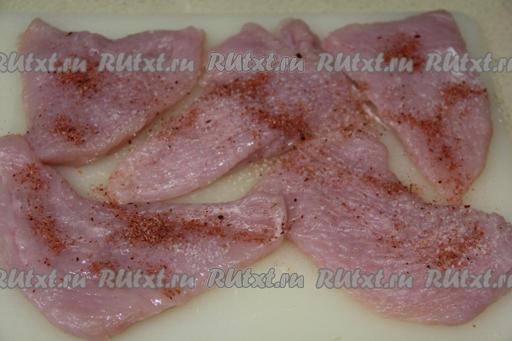 Отбитые кусочки мяса посолить по вкусу и посыпать специями (я добавила специи для птицы). Втереть соль и специи в филе индейки.