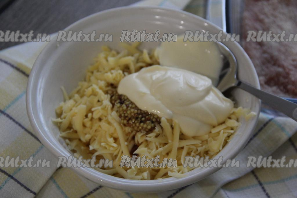 Сыр натереть на тёрке, выложить в миску, добавить майонез, соевый соус и горчицу.