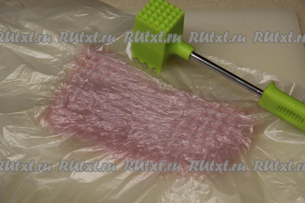 Филе индейки нарезать на кусочки толщиной, примерно, 1 сантиметр. Накрыть кусочки филе прозрачным целлофановым пакетом (или пищевой плёнкой) и отбить мясо с двух сторон кулинарным молоточком.