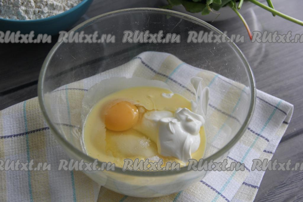 Замесим тесто для пирога, для этого в объёмной миске нужно соединить сметану, яйцо, сахар, соль и растопленное масло.