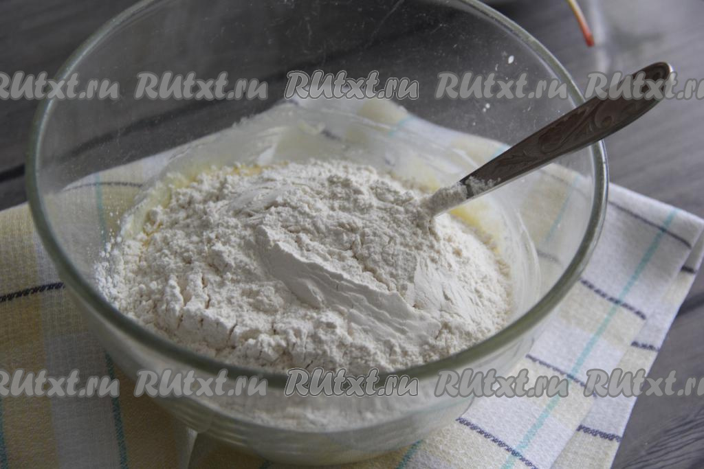 Всыпать разрыхлитель, постепенно добавляя муку, замесить тесто.