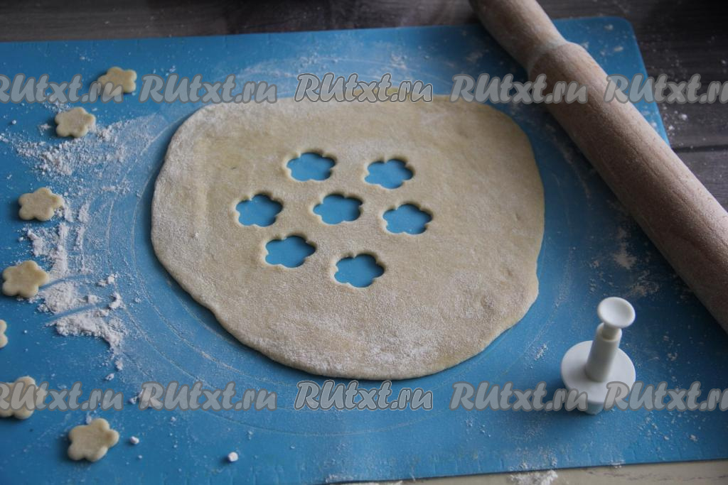 Меньшую часть теста раскатать в небольшой круг, а затем можно нарезать на полоски или сделать фигурную решётку, или оформить по желанию. Я вырубкой для печенья вырезала в центре круга цветочки.