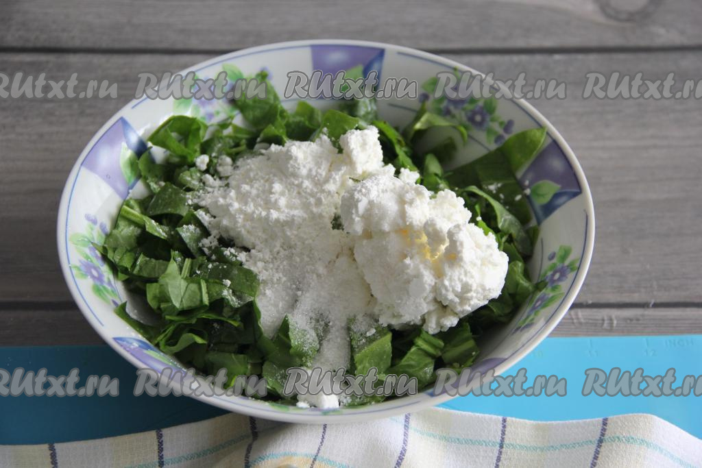 Щавель промыть, затем обсушить его и нарезать на полоски шириной 1 сантиметр. Соединить в миске творог, нарезанный щавель, сахар и крахмал.