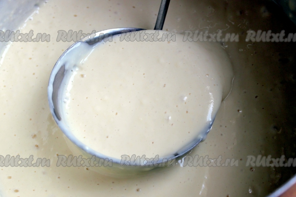 Тесто для нашего простого и очень вкусного торта готово. Для выпекания трёх коржей понадобилось по 2 поварёшки теста на каждую силиконовую круглую форму диаметром 24-25 см.