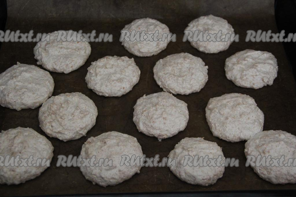 Противень застелить ковриком для выпекания (или пергаментом). Выложить массу с помощью столовой ложки, сформировав круглое печенье. У меня получилось 14 штук.