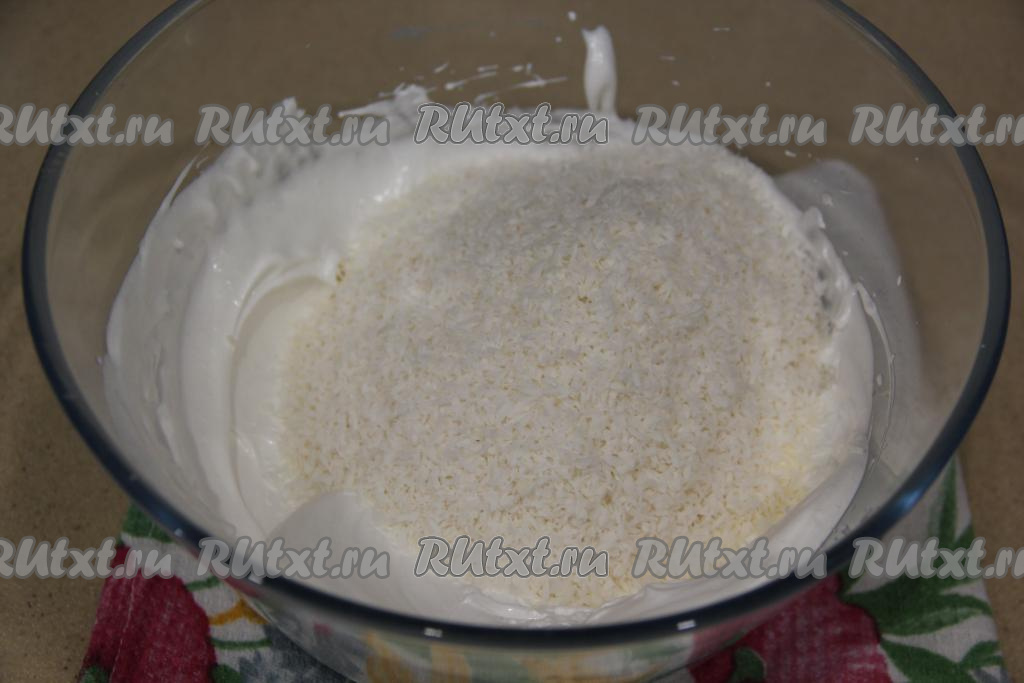 Всыпать в белковую массу кокосовую стружку.