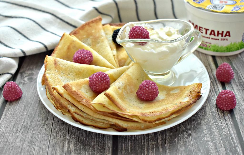Блины, замешанные на сметане и кипятке, получаются бархатистыми, тонкими и аппетитными. Эти заварные блинчики хороши на вкус и тёплыми, и полностью остывшими.