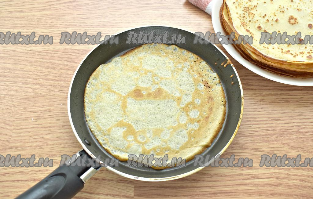 Сковороду смазываем перед выпечкой блинов растительным маслом. Поверхность хорошо разогреваем. Половником зачерпываем порцию блинного теста и распределяем её по поверхности сковороды. Каждый блинчик жарим, как обычно, с двух сторон до румяности (примерно, по 1 минуте с каждой стороны), затем перекладываем на тарелку. Периодически перемешивая блинное тесто в миске и смазывая сковороду перед жаркой блинов по мере необходимости, постепенно выпекаем все блины, складывая их один на другой на тарелку. Я жарила на сковороде диаметром 18 сантиметров, у меня получились 13 заварных блинчиков.
