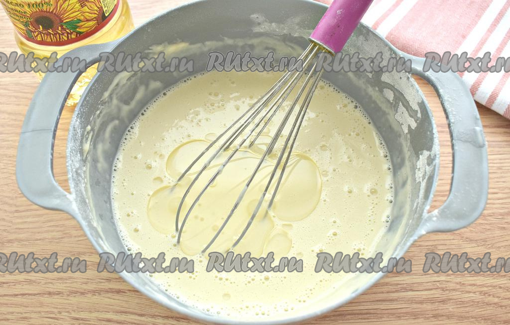 2 столовых ложки растительного масла сразу вливаем в получившееся блинное тесто, перемешиваем. Миску с тестом прикрываем полотенцем и оставляем минут на 15 постоять при комнатной температуре.