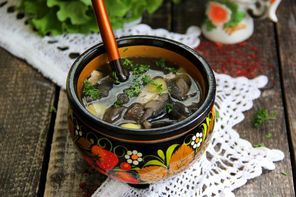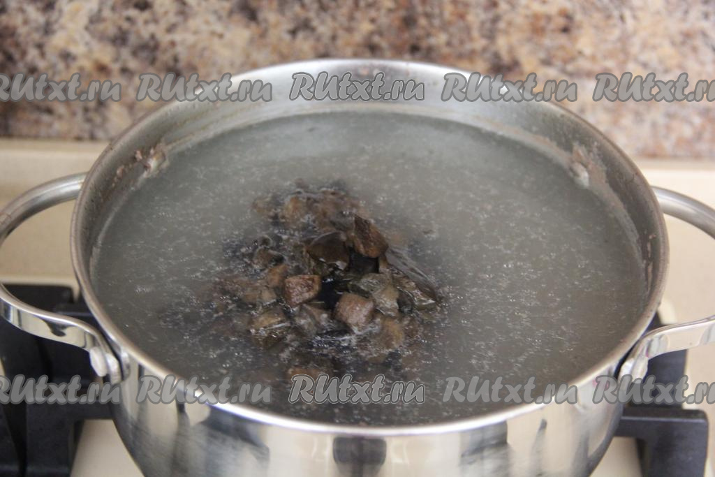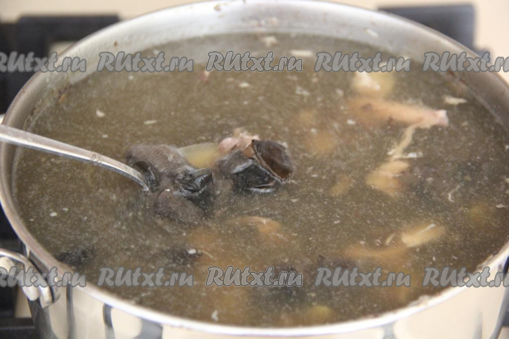 Как только бульон закипит, снять пенку. Варить минут 30 на небольшом огне. Достать части курицы, остудить и отделить мясо от костей. Добавить в бульон грибы и лавровый лист. Если вы готовите суп со свежими лесными грибами, тогда переберите их, тщательно промойте водой, крупные грибочки разрежьте на части, выложите в бульон и варите с момента закипания минут 30 на небольшом огне. Я варила суп с предварительно отваренными замороженными лесными грибами, их нужно выложить в куриный бульон и варить на небольшом огне с момента закипания 15 минут. Если же варите суп с вешенками или шампиньонами, тогда их следует промыть, нарезать некрупно, выложить в бульон и тоже проварить минут 15 с момента закипания.