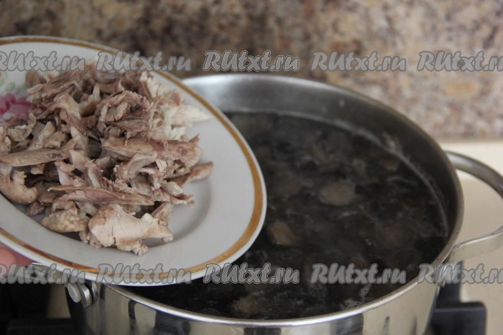 По истечении времени в куриный бульон с грибами добавить куриное мясо.