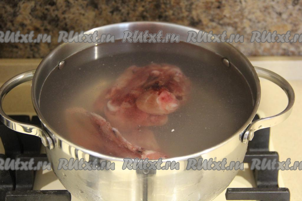 В кастрюлю выложить куриное мясо (например, грудку или пару ножек, или суповой набор). Я взяла куриный суповой набор, с него и навар хороший, и мясо есть. В кастрюлю с кусочками мяса влить 2,5 литра воды и поставить на огонь.