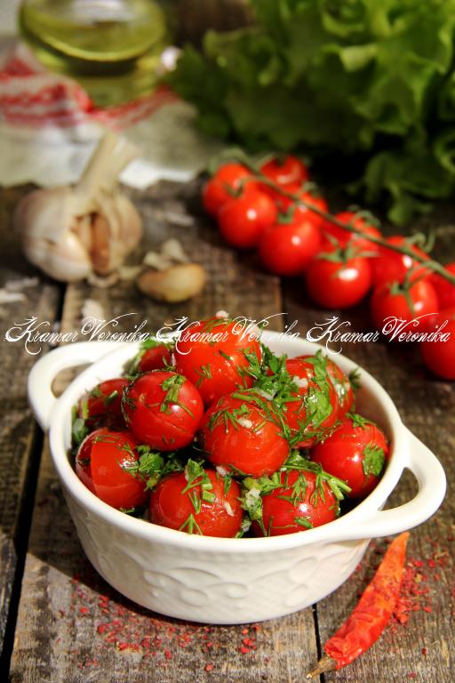 Недавно нашла простой рецепт быстрого приготовления маринованных помидоров черри с чесноком. Приготовила и осталась довольна результатом. Маринованные черри получились очень вкусными, пикантными. Такие помидорчики можно подать к столу уже через час в качестве дополнения к картошке или другим блюдам. Всем советую этот простой рецепт приготовления аппетитных, вкусных и ароматных маринованных черри!